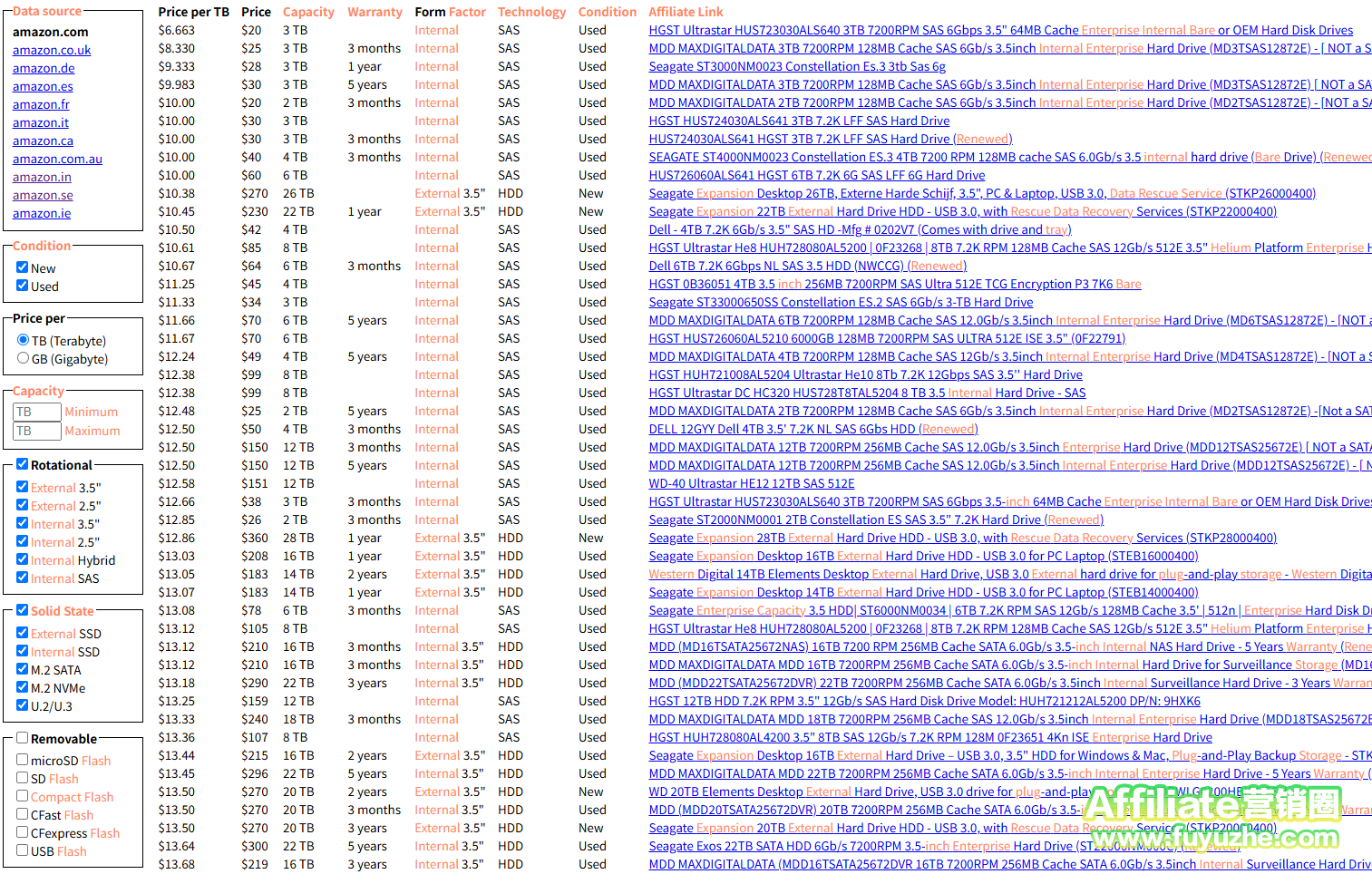 diskprices.com用最demo级的简陋表格,没有Banner,没有Slogan,甚至不用CSS渲染,一个页面一张Excel表格,把亚马逊所有硬盘按容量、价格、折扣摆桌上。